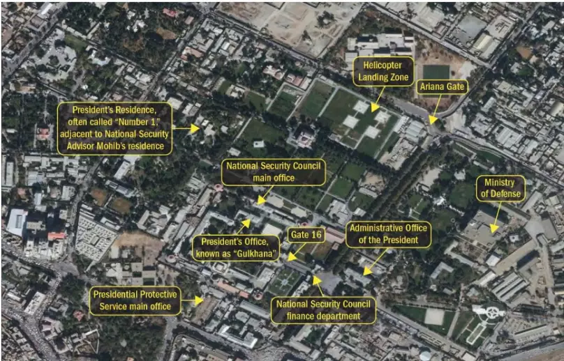 حدود ساعت ۲ بعد از ظهر یکشنبه، برخی از رده بالاترین مقامات که هنوز در کاخ باقی مانده بودند به منطقه پرواز هلیکوپترها رفتند. آنها در آن موقع فکر میکردند رئیس جمهور در کاخ باقی خواهد ماند. سه تا از چهار تا هلیکوپتر تدارک دیده شده برای جابجایی اشرف غنی، در آنجا حاضر بودند. این سه هلیکوپتر برای حمل و نقل مقامات ارشد طراحی شده بودند و هر کدام حدودا قابلیت جابجایی ۹ مسافر را داشتند. اما هلیکوپتر چهارم متعلق جابجایی گروه محافظ رئیس جمهور بود و تا حدود ۲۶ مسافر را در خود جا میداد.