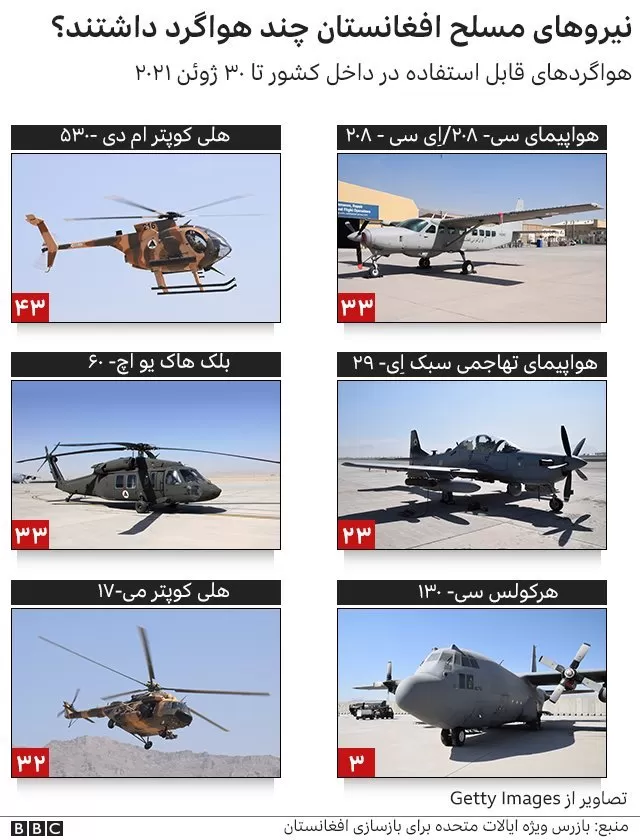 به گزارش سیگار، دفتر سربازرسی ویژه آمریکا برای بازسازی افغانستان که مقرش در ویرجینیاست، درست تا پیش از بازگشت امارت اسلامی به قدرت (تا اواخر ژوئن پارسال)، قوای هوایی افغانستان ۱۶۷ هواگرد عملیاتی شامل هلیکوپتر رزمی و هواپیمای جنگنده داشت.